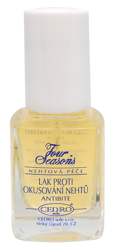 Při problémech s okusováním nehtů je zde lak proti okusování nehtů FOUR SEASONS® s extraktem pomerančové kůry. Tento přípravek odrazuje od okusování nehtů a nehtové kůžičky, upozorňuje svou hořkostí na počátek okusování a tím posiluje vůli zbavit se tohoto zlozvyku. Je určen pro ženy i muže, má dlouhotrvající účinky, posiluje strukturu nehtů a zajišťuje jejich normální růst. Nanáší se na nehty dle potřeby, kde vytváří průhlednou vrstvu. Obsahuje UV stabilizátor.